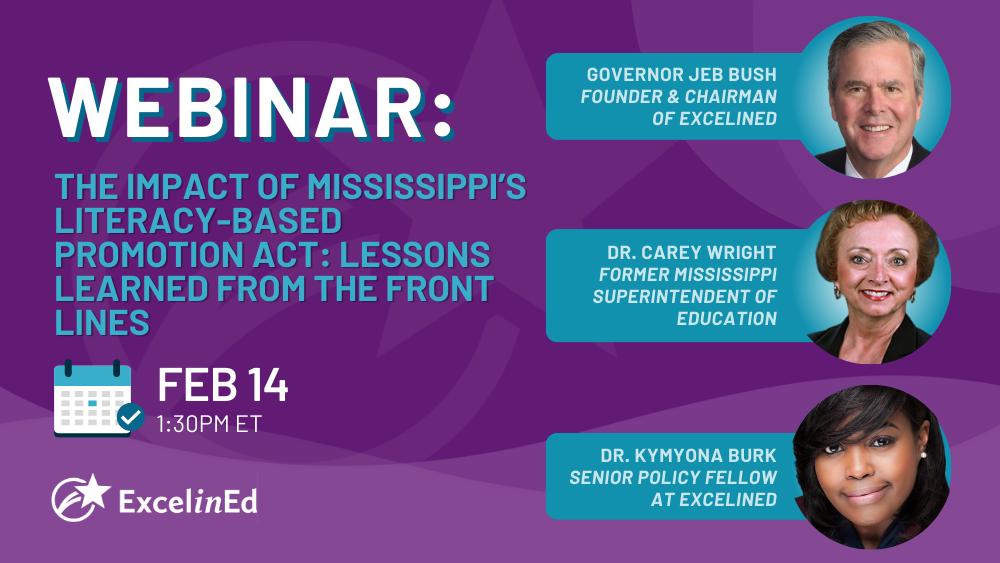 After years of struggling to improve Mississippi’s low reading scores, state legislators made history in 2013 by passing the Literacy-Based Promotion Act. For the first time, the Magnolia State had a comprehensive approach to improving literacy outcomes for all students. Moderated by Governor Jeb Bush, Mississippi’s Former Superintendent Dr. Carey Wright and ExcelinEd’s Dr. Kymyona Burk share lessons learned from the front lines of taking Mississippi from the bottom to the top of literacy achievement.