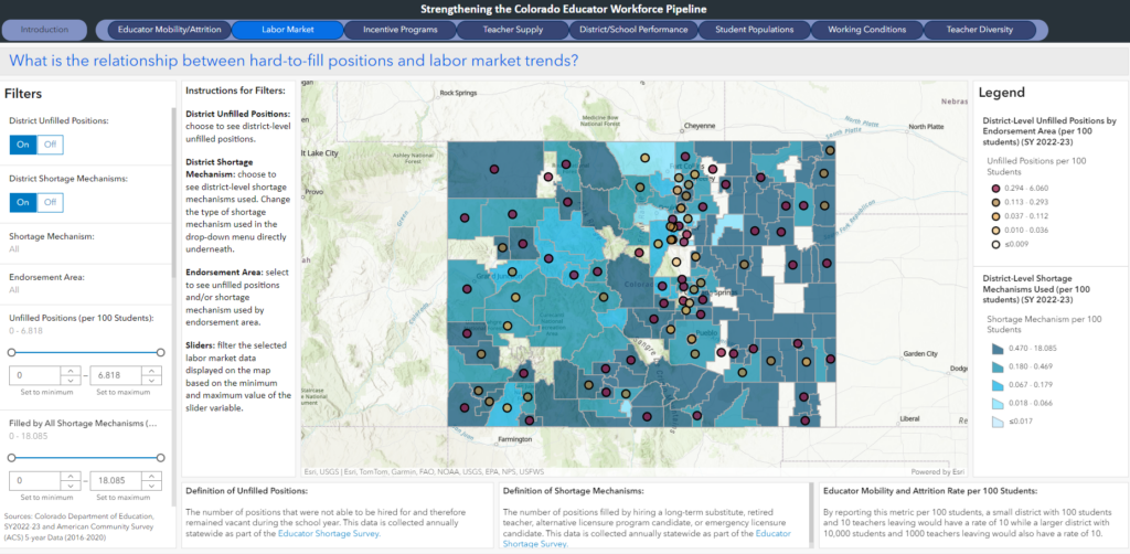 Colorado is the only state that meets all of NCTQ’s recommended metrics for educator supply-and-demand data. Beyond simply collecting the data, Colorado’s interactive Graphic Information Systems maps provide clear, district-level visualizations. This makes its dashboard of data readily accessible to all stakeholders, and it covers a spectrum of teacher policy concerns, such as the number of new teachers graduating by EPP, teacher mobility/attrition and even housing affordability.