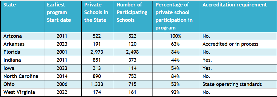 With a couple exceptions, we found a clear difference in private school participation between state programs that require accreditation and those that do not. Arizona, Florida, North Carolina and West Virginia all have participation rates ranging from 84% to 100%, while Arkansas, Indiana and Iowa’s rates range from 44% to 63%. These numbers do not prove direct causation, but they do point to a strong relationship between program accreditation requirements and limited options for participating students.