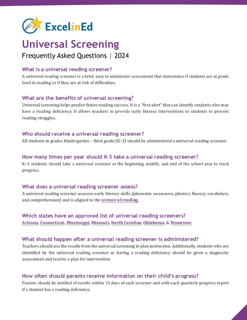 A universal reading screener is a brief, easy to administer assessment that determines if students are at grade level in reading or if they are at risk of difficulties.
