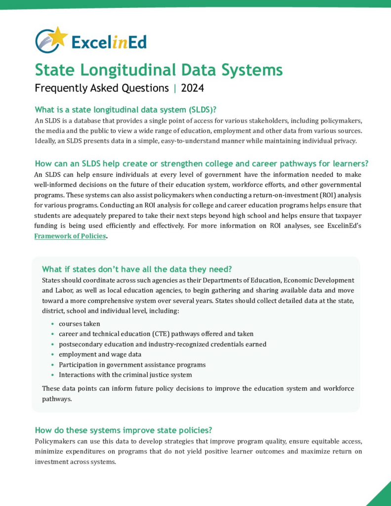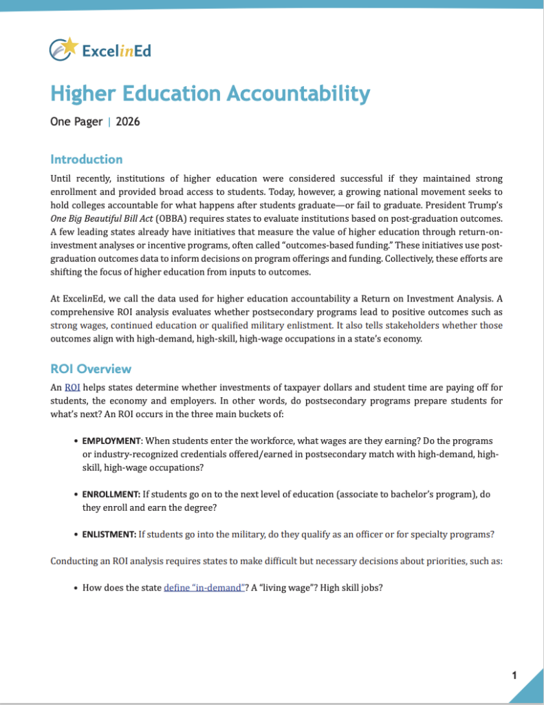 At ExcelinEd, we call the data used for higher education accountability a Return on Investment Analysis. A comprehensive ROI analysis evaluates whether postsecondary programs lead to positive outcomes such as strong wages, continued education or qualified military enlistment. It also tells stakeholders whether those outcomes align with high-demand, high-skill, high-wage occupations in a state’s economy.