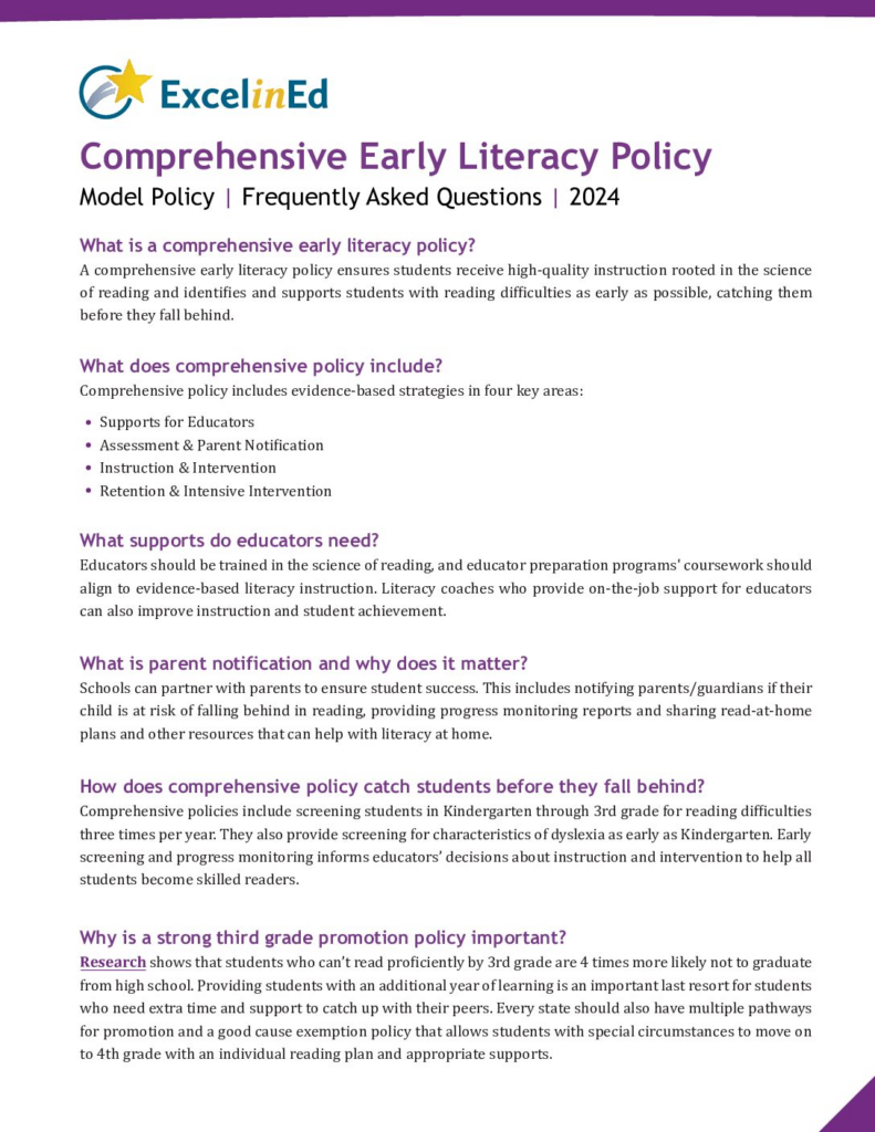 A comprehensive early literacy policy ensures students receive high-quality instruction rooted in the science of reading and identifies and supports students with reading difficulties as early as possible, catching them before they fall behind.