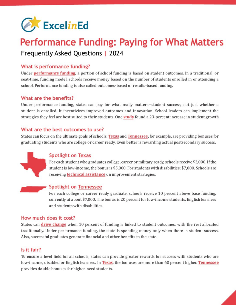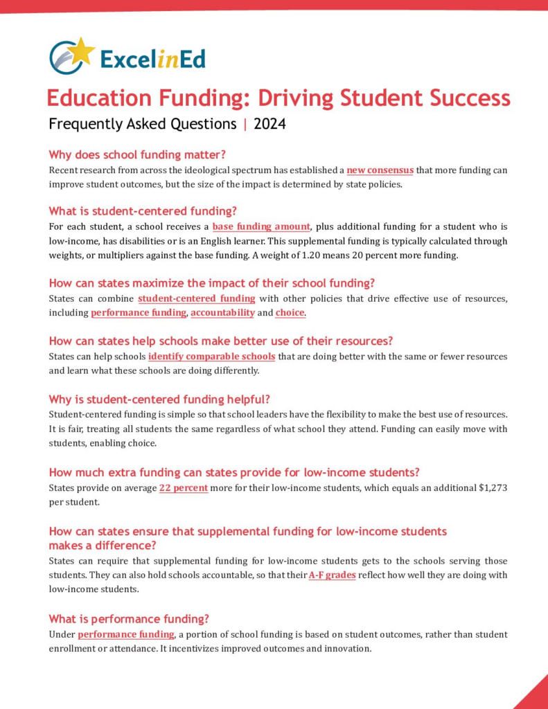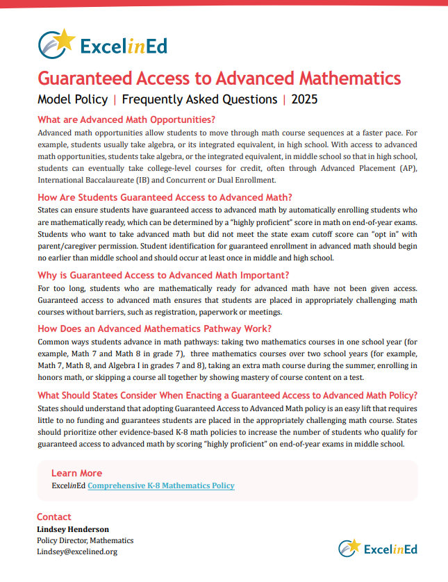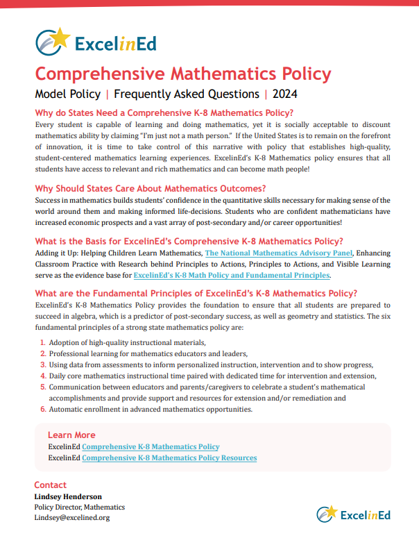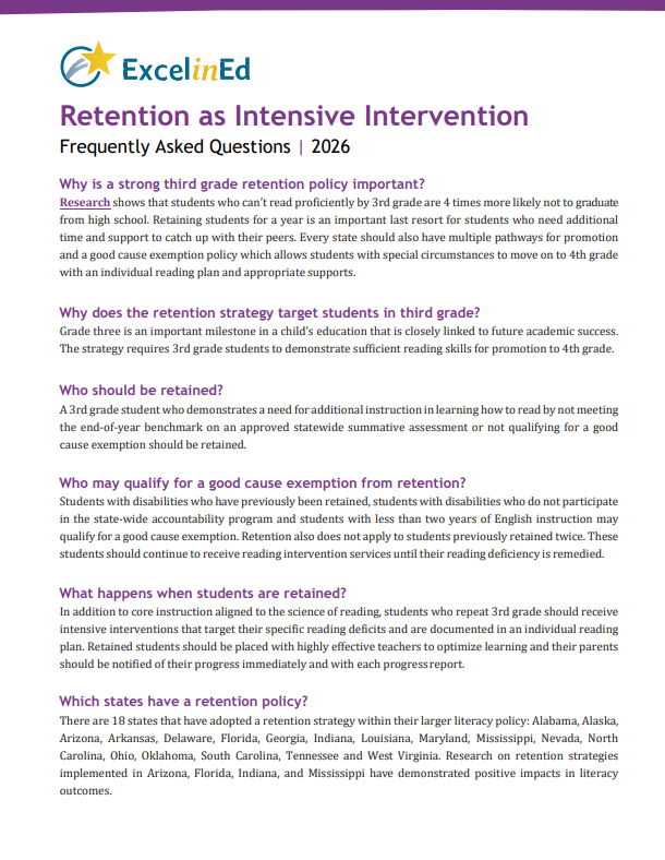 ExcelinEd is a national nonprofit transforming K-12 education to ensure success for every child with student-centered, state-based policy solutions. We collaborate with partners and education leaders to research, develop and implement policies that prioritize early literacy, empower families with education choice, expand innovation, strengthen school performance and prepare students to transition from education to the workforce.