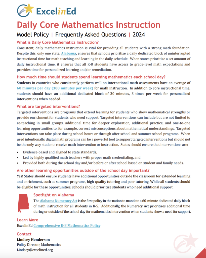 Consistent, daily mathematics instruction is vital for providing all students with a strong math foundation. Despite this, only one state, Alabama, ensures that schools prioritize a daily dedicated block of uninterrupted instructional time for math teaching and learning in the daily schedule. When states prioritize a set amount of daily instructional time, it ensures that all K-8 students have access to grade-level math expectations and provides time for personalized learning and/or remediation.